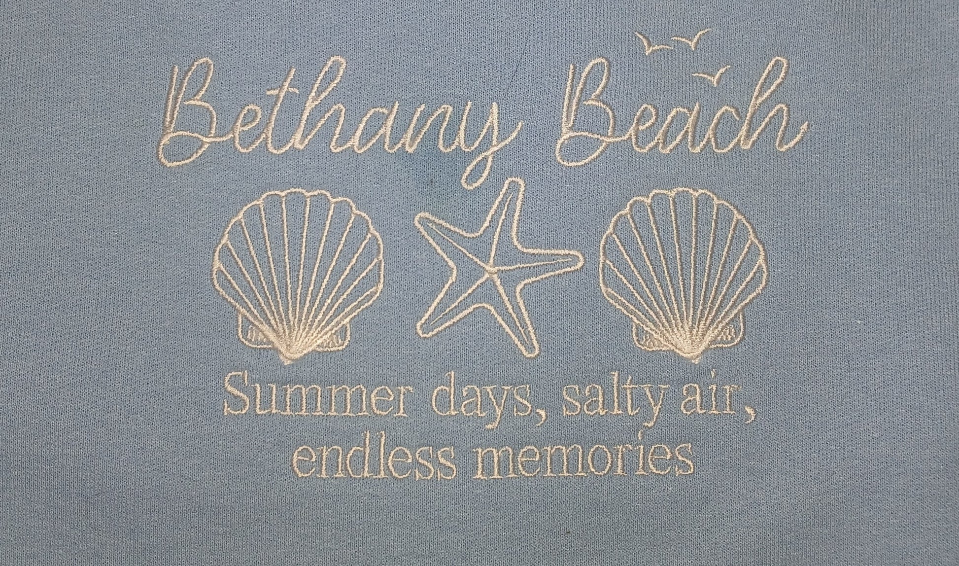 This comfortable light blue sweatshirt features elegant white embroidery showcasing the beloved Bethany Beach with seashells, starfish, and the inspiring message 'Summer days, salty air, endless memories.' ✨