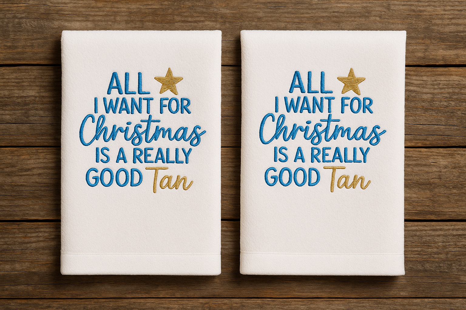 Bring some sunny humor to your holiday decor with these playful 'All I want for Christmas is a really good tan' embroidered hand towels. Perfect for those who dream of warm beaches during the winter holidays or live where Christmas means sunshine and sand!