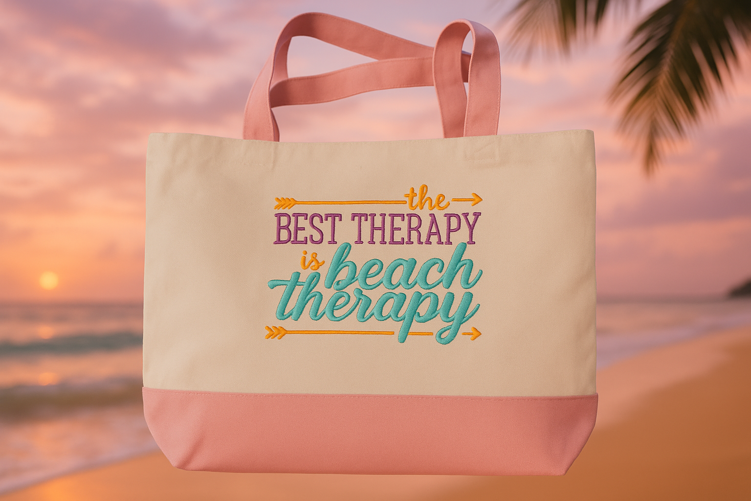 This charming canvas tote bag features the uplifting embroidered message "The BEST THERAPY is beach therapy" in beautiful multi-colored stitching with decorative arrows. Perfect for beach lovers who know that sand between your toes and ocean waves are the ultimate stress relief.
