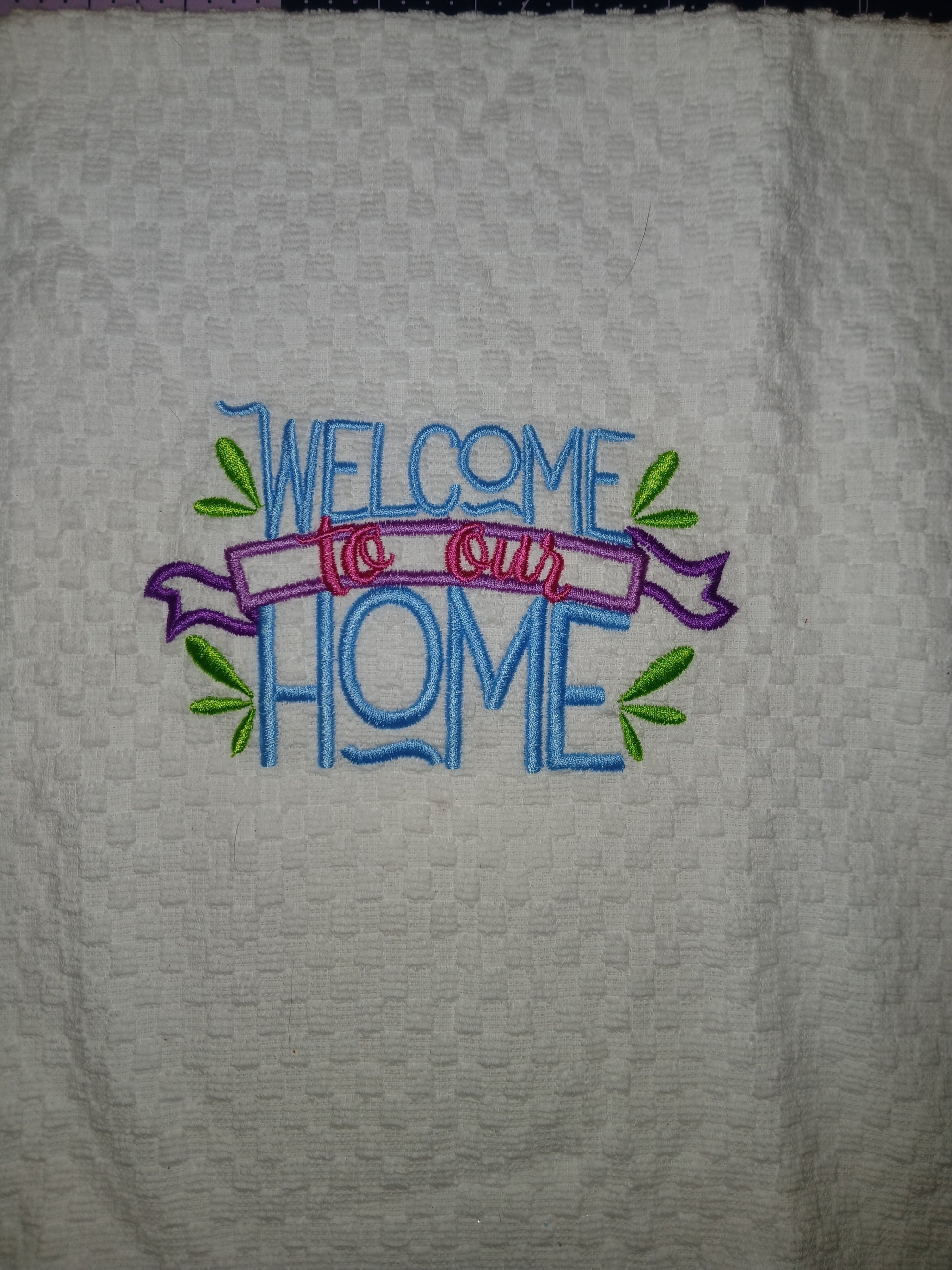 Embroidered with “Welcome to Our Home” in a stylish script font