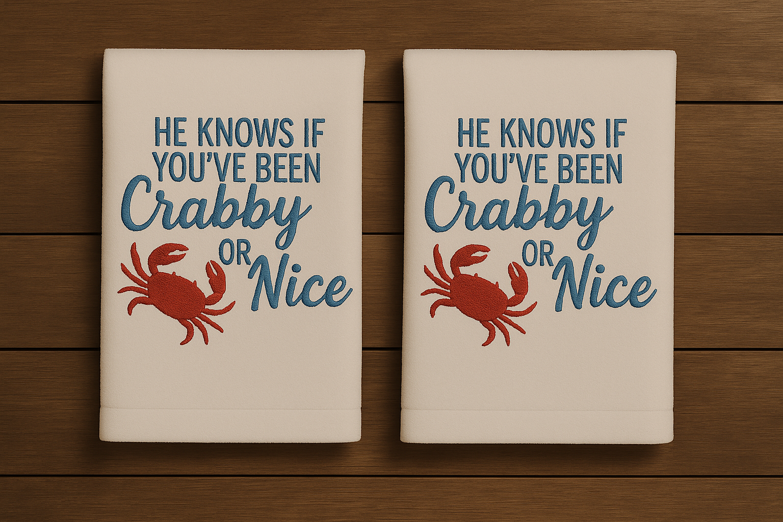 Add a touch of seaside humor to your holiday decor with these delightful, embroidered hand towels. Featuring the playful phrase 'He knows if you've been Crabby or Nice' with an adorable red crab, these towels are perfect for beach house Christmas celebrations.