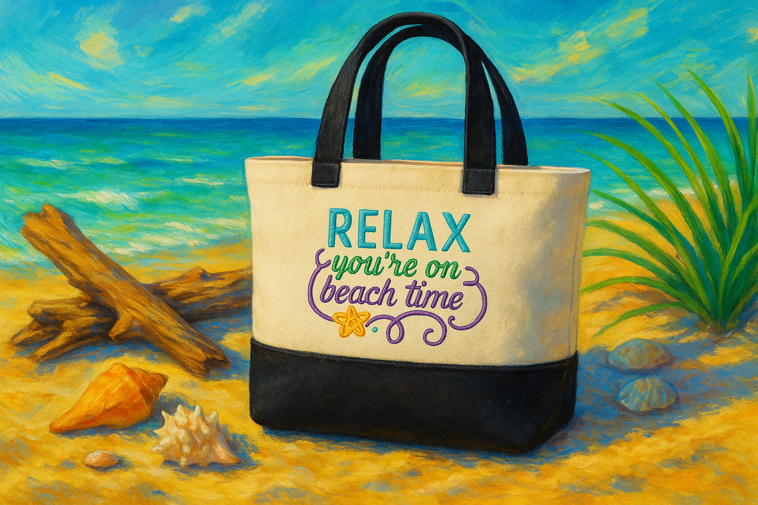 Embrace the beach vibes with this beautiful 'Relax You're on Beach Time' embroidered tote bag!