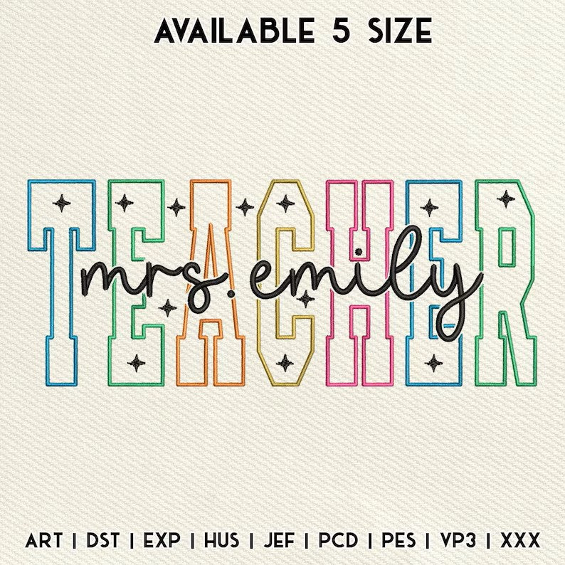 Make it personal with our vibrant TEACHER name sweatshirt! This eye-catching design features colorful block letters spelling 'TEACHER' in blue, green, orange, yellow, pink, and teal with playful star accents, and your custom name beautifully embroidered in elegant black script across the center.