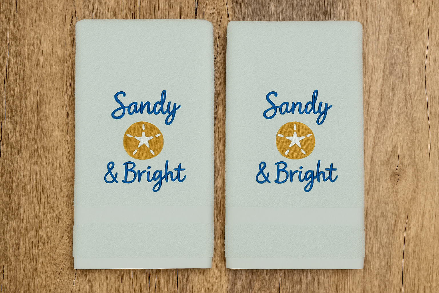 Brighten up your bathroom with these beautiful 'Sandy & Bright' embroidered hand towels featuring an elegant sand dollar design. Perfect for bringing coastal charm and seaside serenity to any space, these towels combine style with functionality.