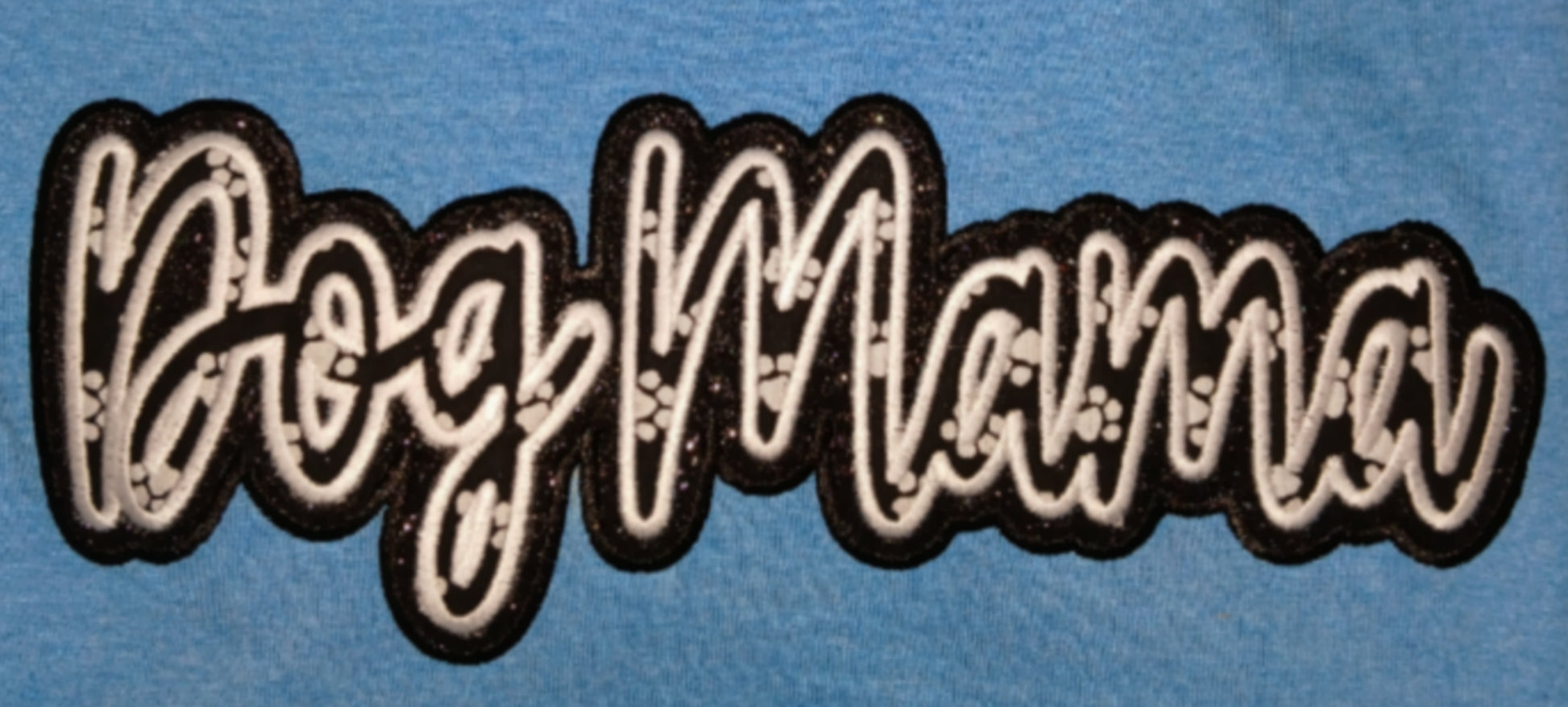 Show off your love for your furry family with this adorable Dog Mama t-shirt! This comfortable, high-quality tee features beautiful embroidered text with s glitter vinyl background and can be personalized with your pet's name(s) on the sleeve.