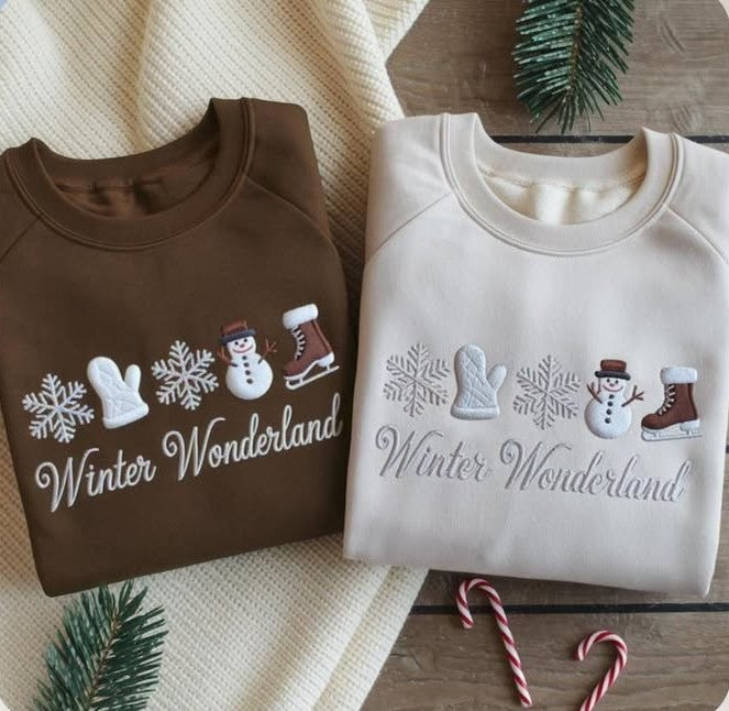 Embrace the magic of the season with our Winter Wonderland Embroidered Sweatshirt. This premium crewneck features charming winter motifs—delicate snowflakes, cozy mittens, a cheerful snowman, and classic ice skates—all beautifully embroidered for a textured, artisan finish.
